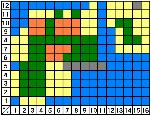 このマップは左下を【X=1,Y=1】としています。つまり一番右上は【16,12】となりますね。