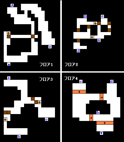 ▲=出入り口 ▼=出入り口に戻る ■=イベント ■=岩(「かいりき」で押せる) ◆=岩(「いわくだき」で壊せる)